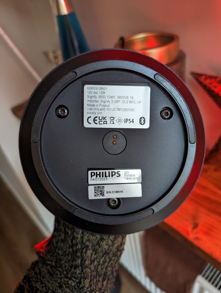 One thing I really like about this lamp is the charging base. You just plonk it down to charge. There is no faffing around with plugging it in as you do with the Hue Go.