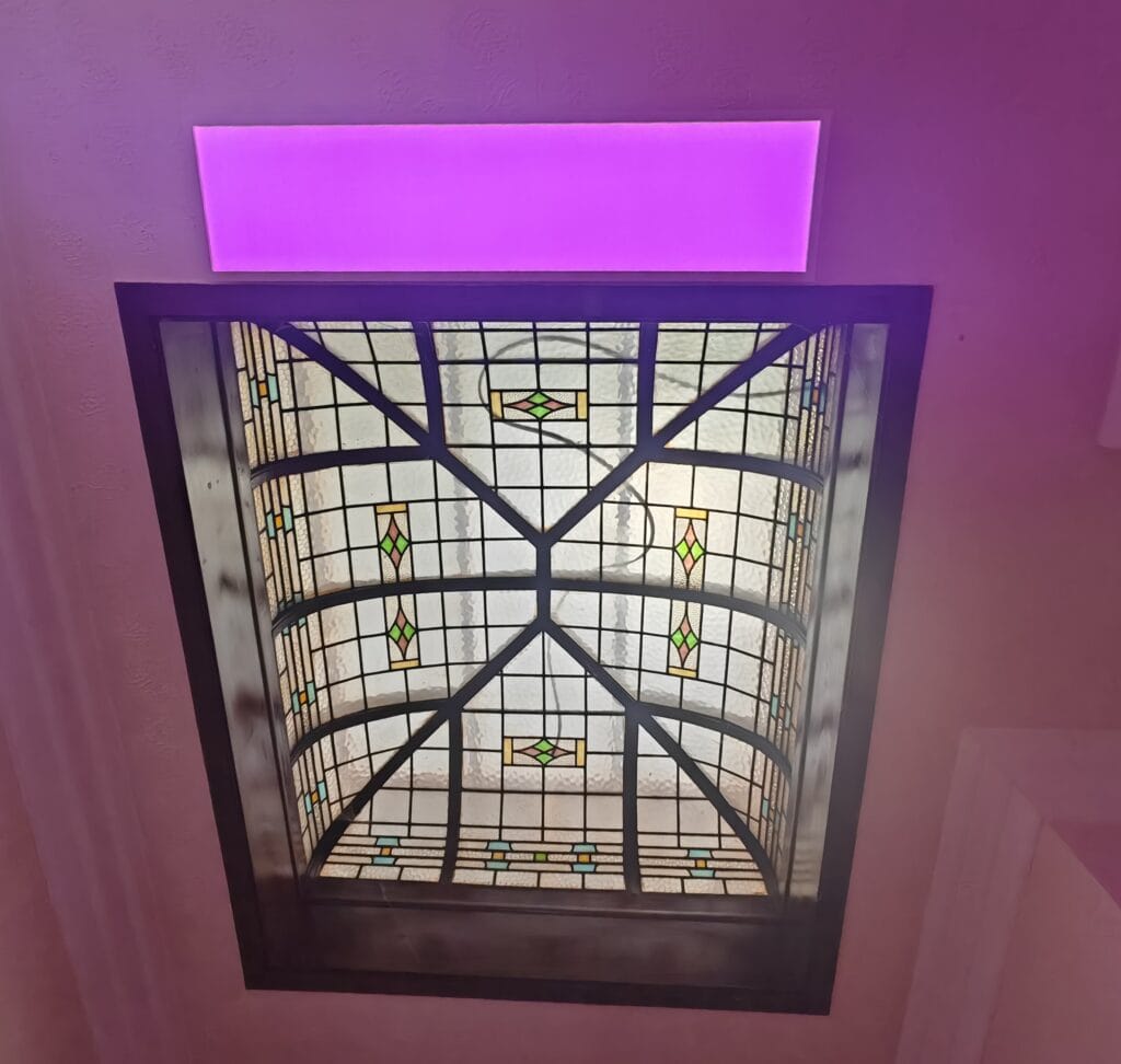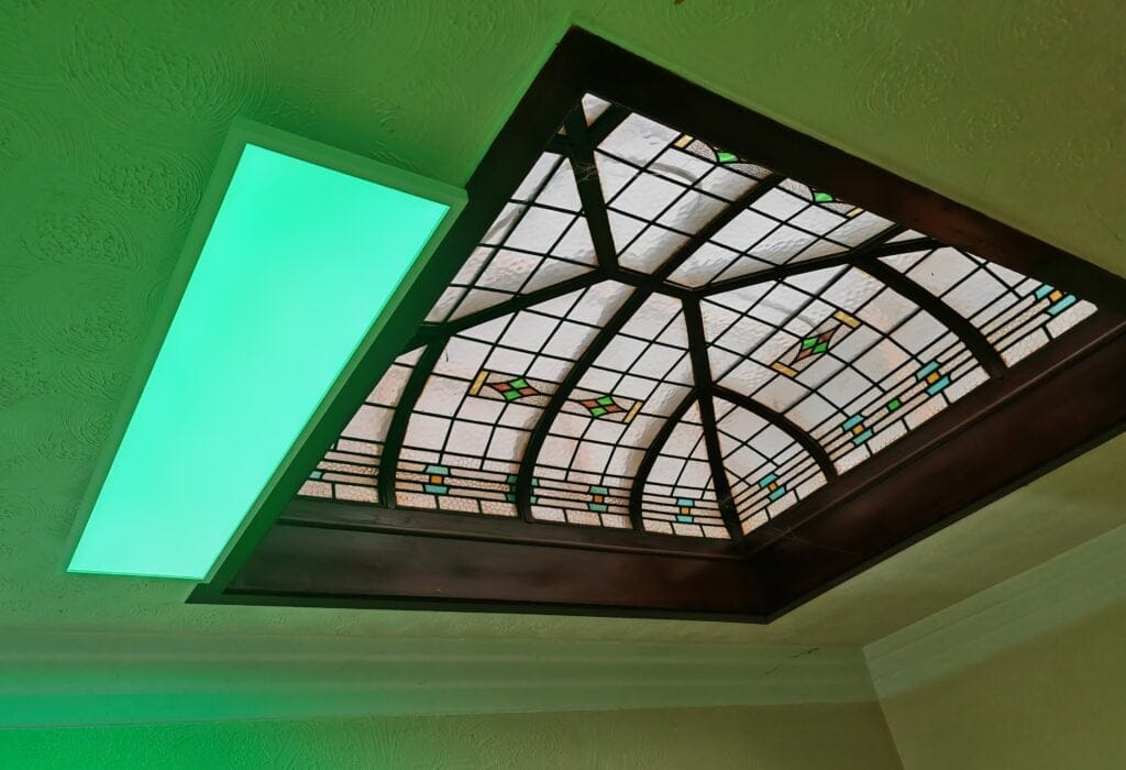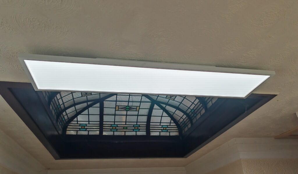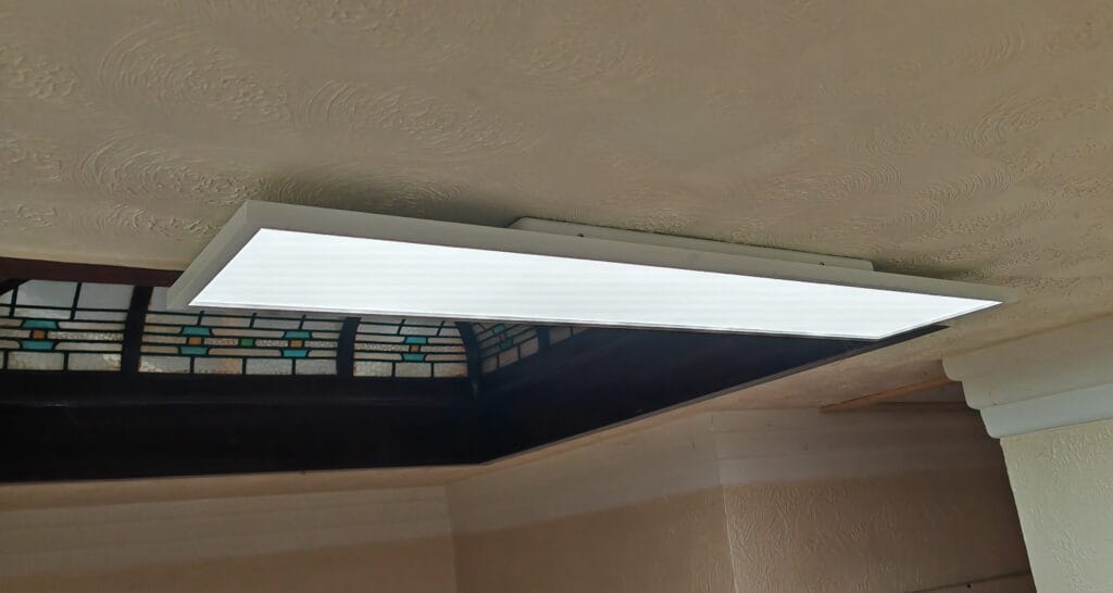The Surimu panel is located in my upstairs hallway. We live in a corner house with an odd design, so there are no external windows in the hallway. We instead have a glass dome that lets limited light through. Therefore, the hallway is permanently dim and needs the light on most of the time.