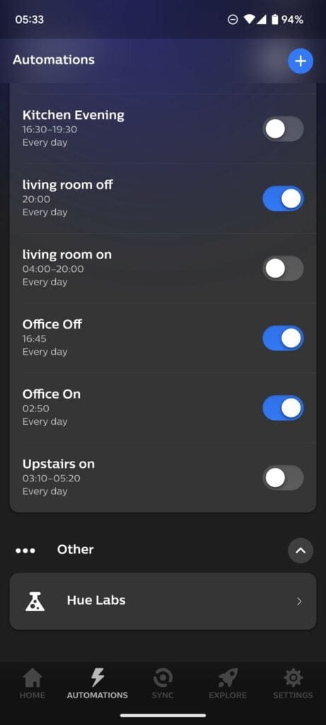 For my home, I have my office lights switched on automatically in the morning and switched off in the evening. It is a simple schedule because I do the same thing every day. I have also recently installed the wall switch module, which allows me to turn everything off using my old dumb switch when I leave the office in the evening.