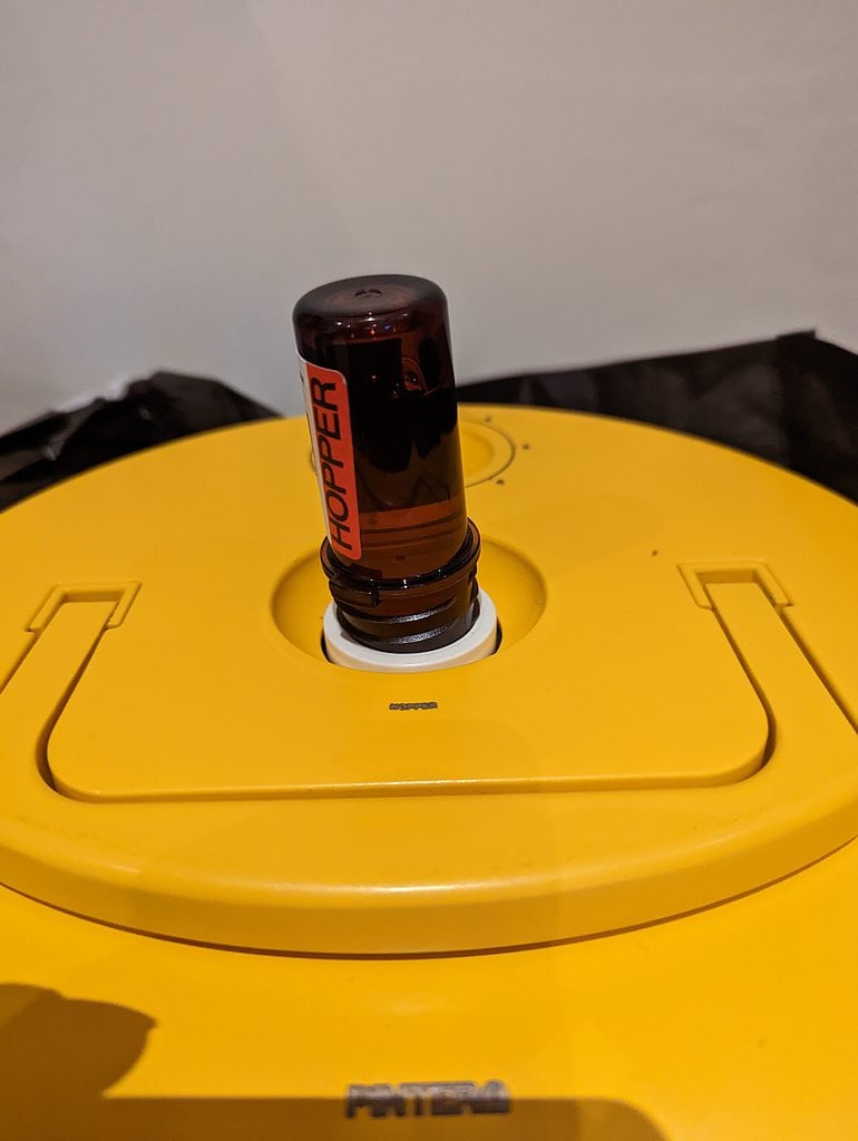 You now have a new port on the back of the Pinter. They have a new range of beers which allows you to add additional hops later into the brewing process. These come in a small hopper bottle which screws into the hopper port without exposing your beer to any nasty contamination.