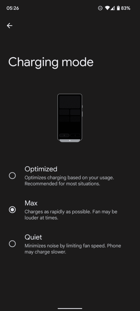 - Customise how fast the phone charges. Optimised will automatically control the charge speed, then max or quiet.