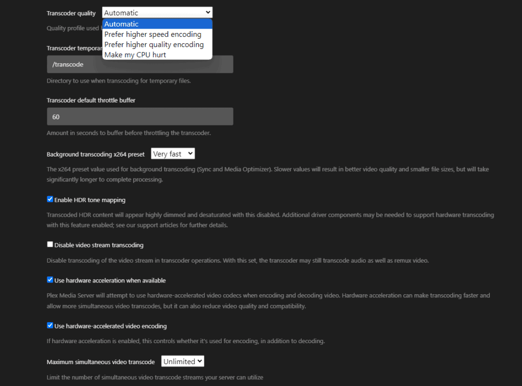Settings > Server > Transcoderand enable “Use hardware acceleration when available.”
