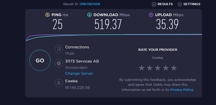 - Amsterdam: 520/35 Mbps DL/UL and 25ms ping