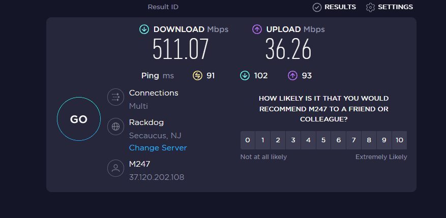 Switching to a US server, I still achieved high speeds with 511/36Mbps, and the ping increased to 91ms