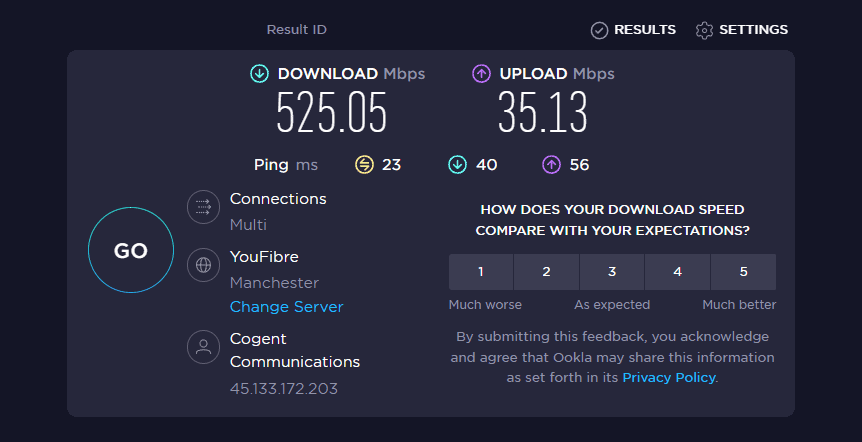 - Manchester Server: 519 / 35 Mbps & 23ms ping