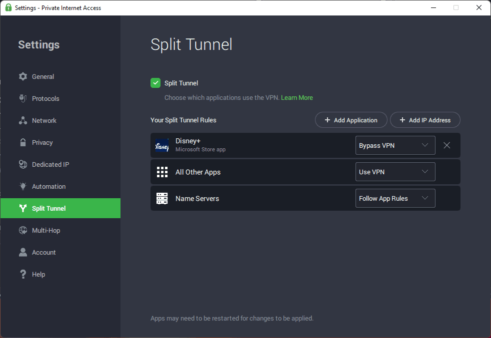 - Set up custom rules for individual apps or websites to automatically use or bypass the VPN tunnel.