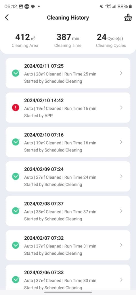 The Proscenic app is well-designed and easy to navigate. The status screen shows the map with cleaning history, next clean, accessories status and the robots current location.