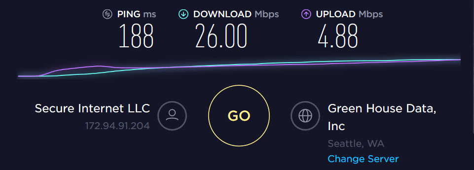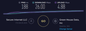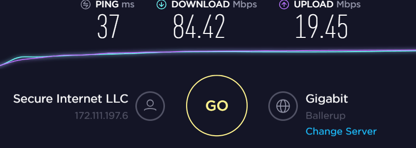 Downloading Ubuntu 18 I achieved 9.6MBs – so about 76.8Mbps, this appeared to be server limited as trying to download Linus Mint from a UK server I got 15.8MBs or about 126Mbs. I then finally tested using Think Broadband which came out with 143.01 Mbps, 20Mbps and latency of 43ms.Geo-bypassing streaming restrictions