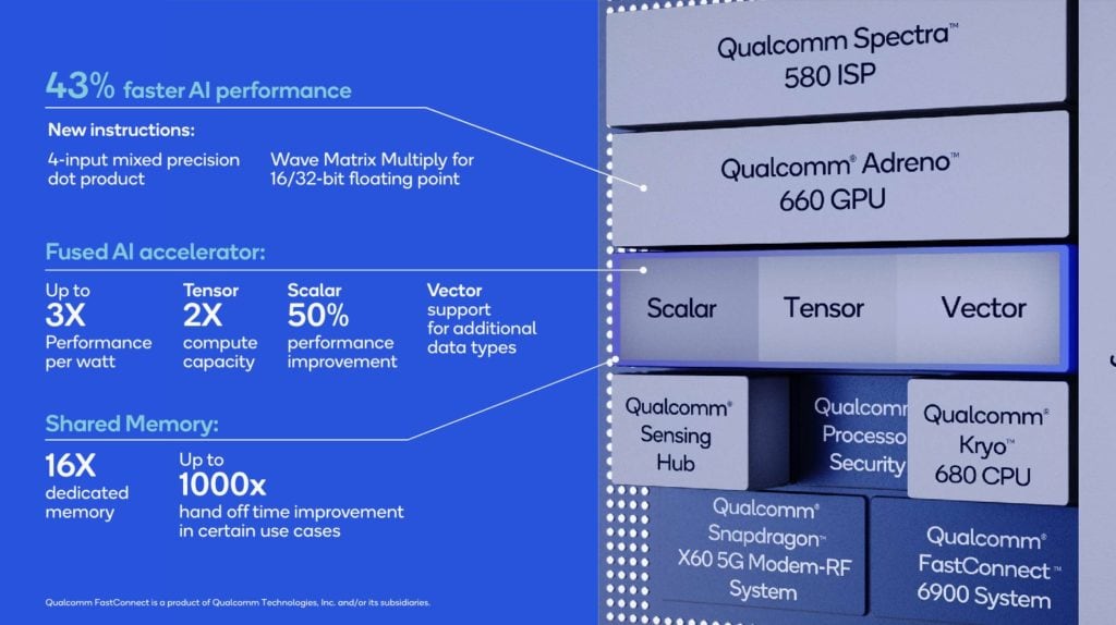 This is another area where Qualcomm is stating massive gains vs the previous generation. There is 16 times more dedicated memory with a 3 fold increase in performance per watt, this results in a 50% improvement in scalar execution capabilities and twice the tensor execution throughput.