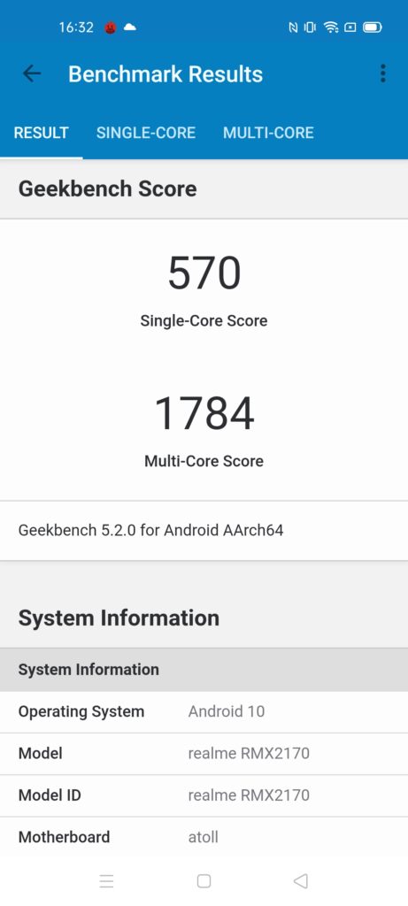 As far as synthetic benchmarks go, this is almost identical to the Realme 6 Pro, which has exactly the same chipset. Antutu is a smidgen higher, 3DMark is almost identical, in Geekbench, the single-core score is almost identical, but the multi-core score is a little higher.