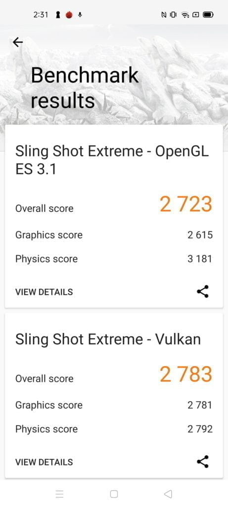 In 3DMark, the Realme 7 managed 2723 and 2783 showing off the small GPU frequency improvement with a 7% increase in scores vs the Realme 6. Once again the MediaTek chipset is better for gaming than the Qualcomm, being over 8% ahead.