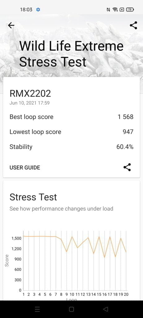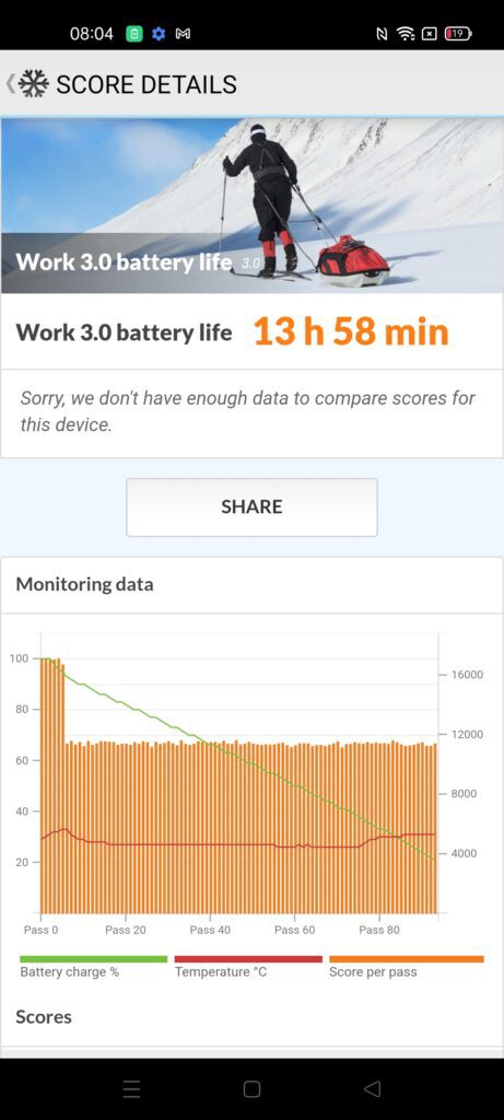 This is particularily true when running the PC Mark 3.0 Battery test. The first few runs appear to achieve scores of over 15K, but this quickly drops down to a little below 12K, which is still an impressive score. The end result is that this achieves a run time of 13h 58m which is 5 hours longer than the OnePlus 9 Pro and nearly 4 hours longer than last years Realme X50 Pro review. Whether this behaviour is accurate for real-world usage is a question I can’t answer, but the phone does seem to perform better than I had expected.