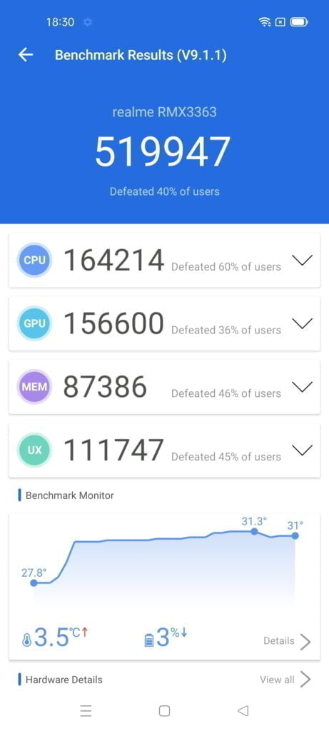 However, if you look at the monitoring data, the Realme GT throttles the performance, dropping by almost 30% after a few runs, while the Realme GT Master retains almost the same performance throughout the entirety of the test.