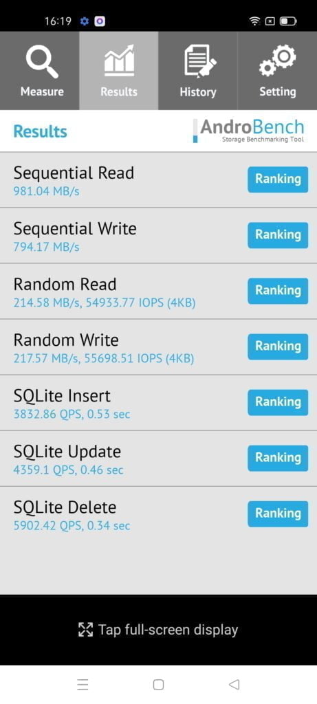 The AndroBench storage speed benchmarks looked a little low at first, but they are actually excellent, it is just the sequential read that falls behind the SD888 equipped GT but the random read/write are almost the same.