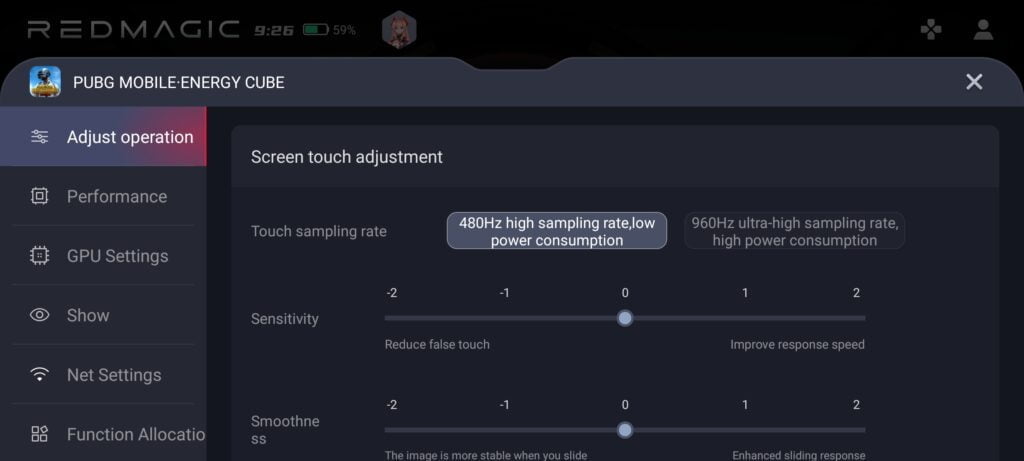 You have options for adjusting touch sensitivity, frame rate, fans, and shoulder triggers.