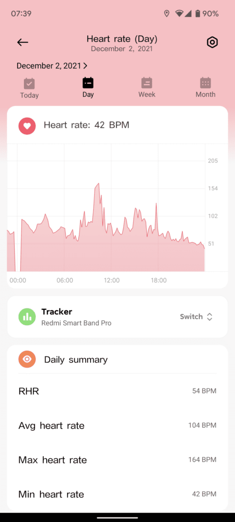 - All-day heart rate – low/high/RHR