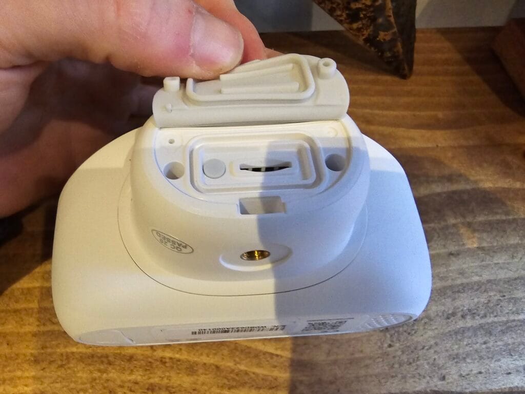 On the base of the camera is a rubber flap protecting the microSD slot and reset button.