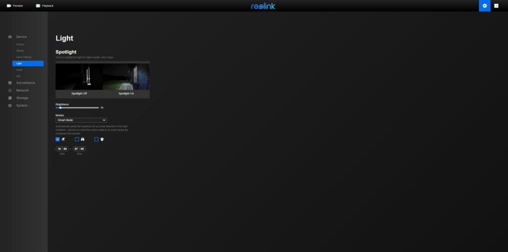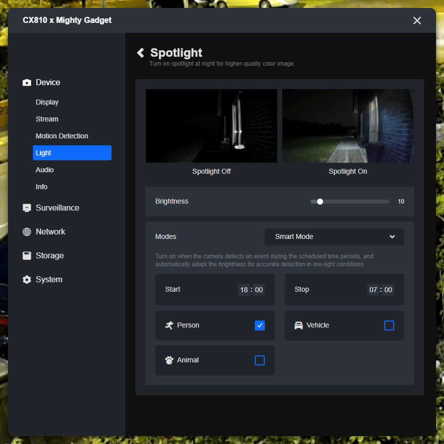 With the spotlights, you have the option to enable them automatically, based on ambient light on a schedule or smart mode, which combines a schedule with advanced motion detection.