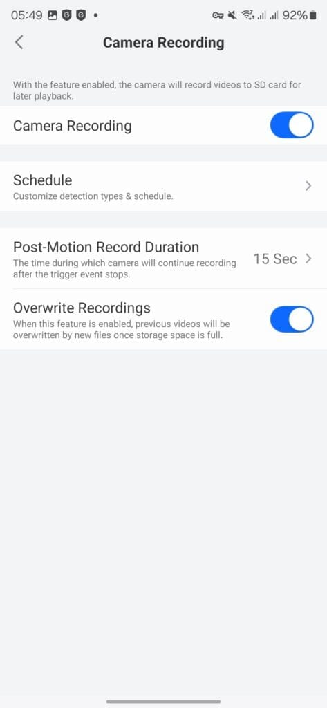 | Recording Modes | Motion-triggered recording (default); scheduled recording, 24/7 recording |