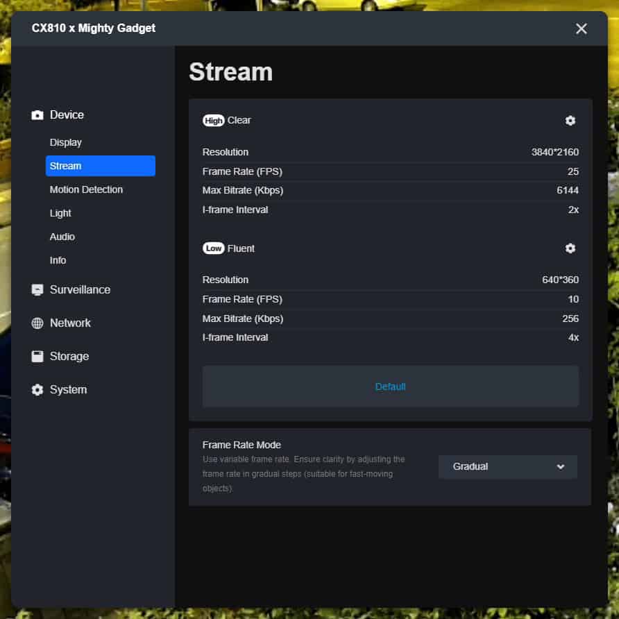 | Frame Rate | Main stream: 2fps – 25fps (default: 25fps); Sub stream: 4fps – 15fps (default: 10fps) |