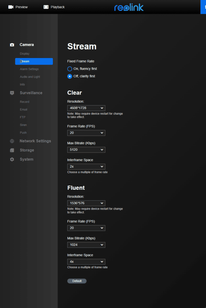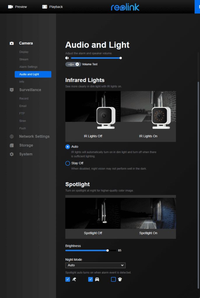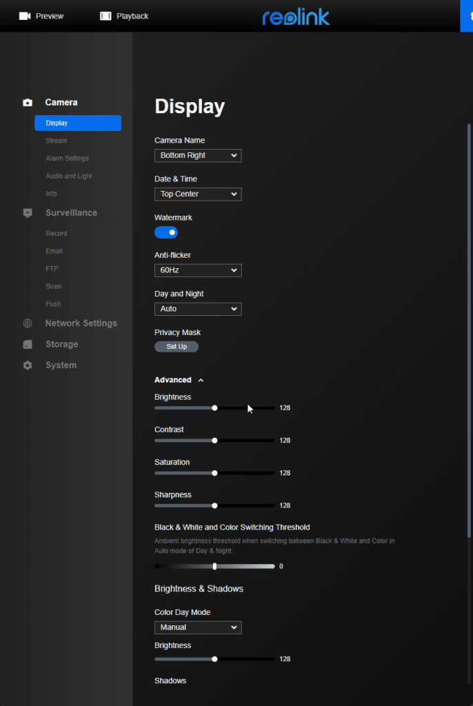 There are fewer settings than there used to be with Reolink cameras. You have an option for Day/Night and Infrared lights but no dynamic backlight options. You can tweak the various brightness, contrast saturation and sharpness settings. Then with each mode, you can manually set brightness and shadows.