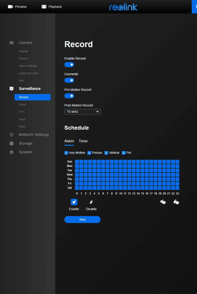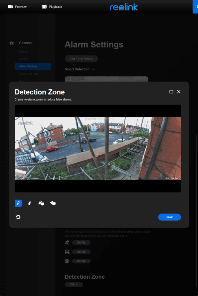 The motion detection is basically the same as all recent Reolink cameras. Due to the very wide field of view, I’d recommend setting up the detection zone. I didn’t, and the camera basically recorded 24/7 to my microSD card because of the cars in the background.