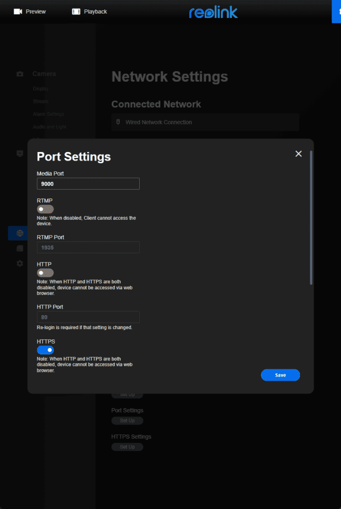 If you are using a third-party NVR such as Blue Iris or Synology Surveillance Station, you will need to enable RTSP/ONVIF within the network settings under the port settings option.
