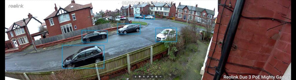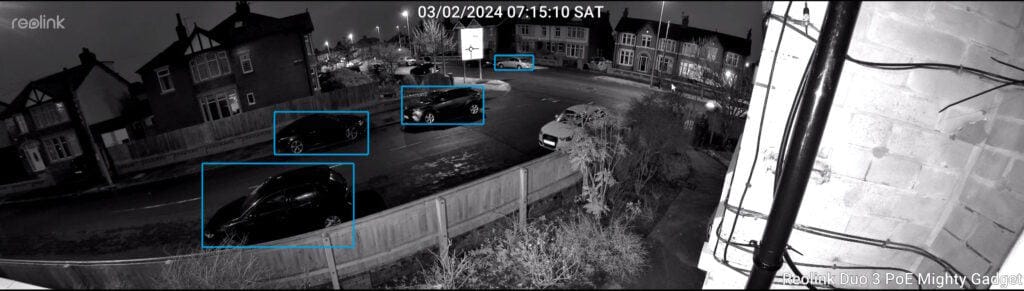 Day time footage is excellent and a significant improvement over the Reolink Duo 2. I initially placed the camera on my windowsill overlooking my front garden and road. I can clearly make out number plates on cars parked nearby, and the street sign over the road is just about readable when zoomed in.