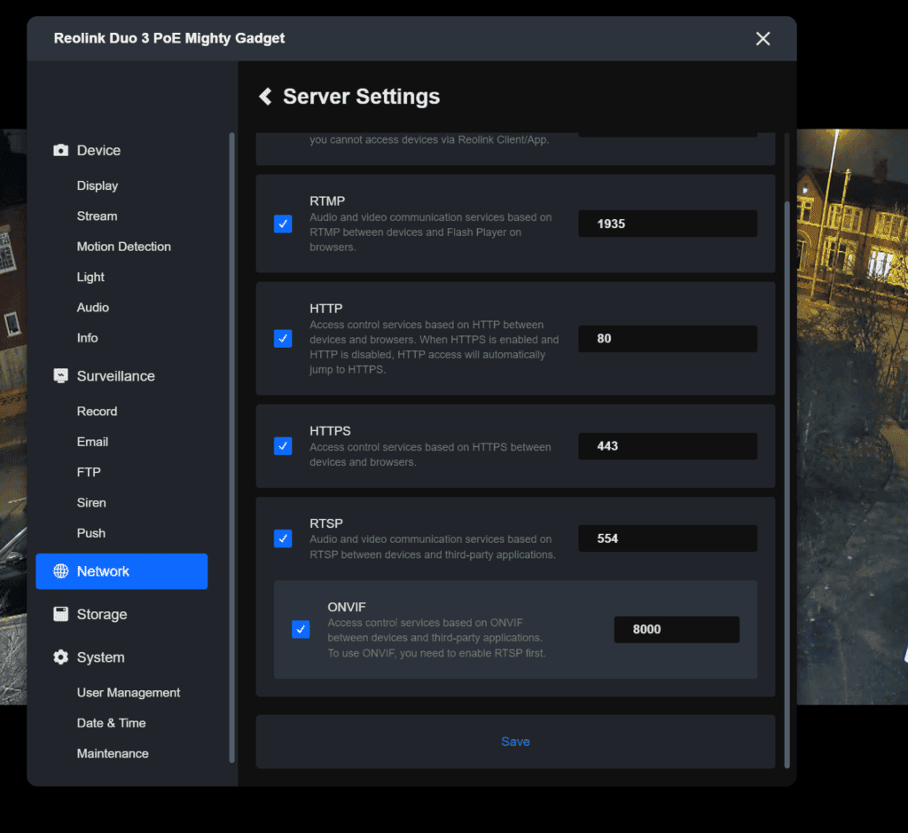 You will need to enable RTSP/ONVIF within the camera settings, which is available under Network > Advanced > Server Settings.