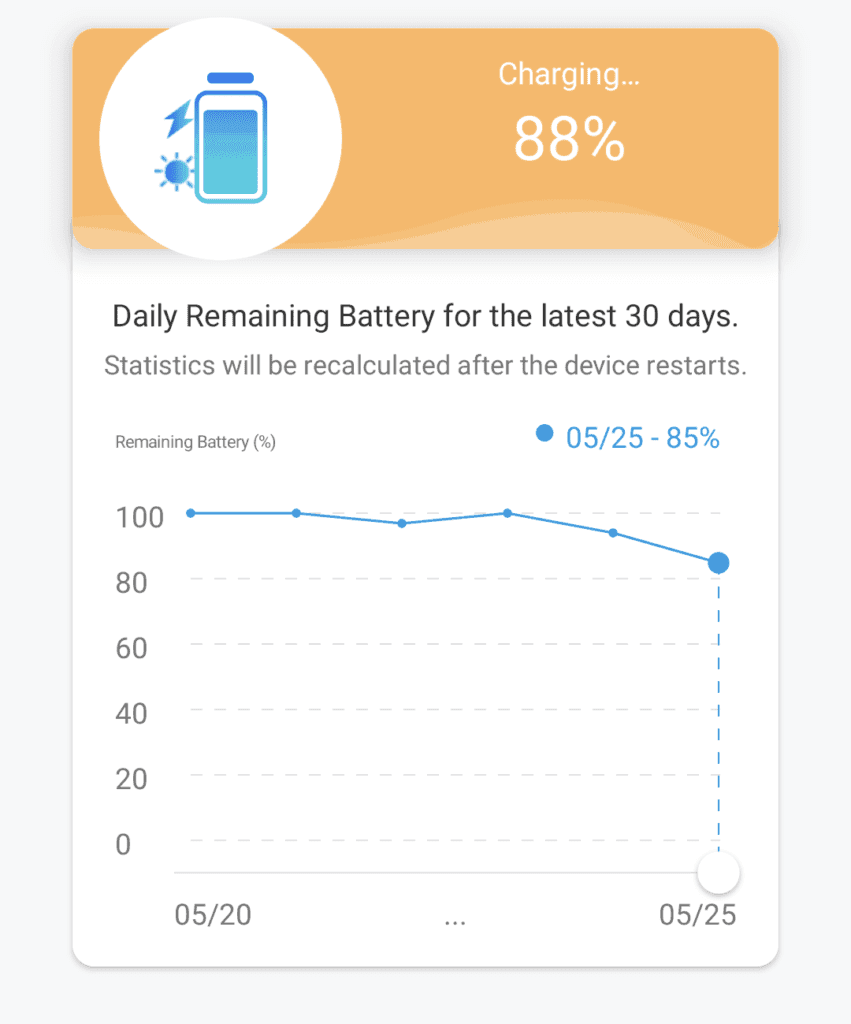 In the first five days of use, the camera went from 100% to 85% based on its graph. At the time of the screenshot, it indicated that the camera was charging, and the actual percentage was 88%