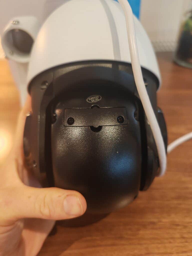 The bracket for the camera is metal, whereas other PTZ cameras often use plastic brackets. This is then separate from the camera, and you run the cable inside the mount with them popping out the base of the mount.