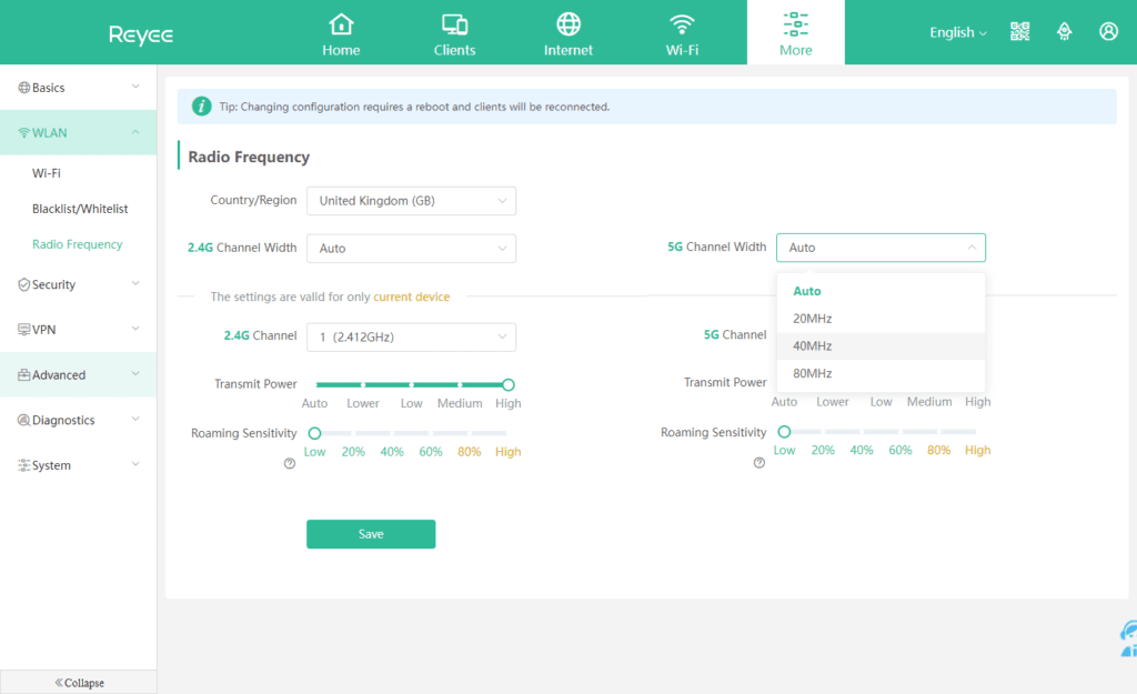Hidden under the browser settings, you will find the radio frequency settings, where you can select the channel and channel width.