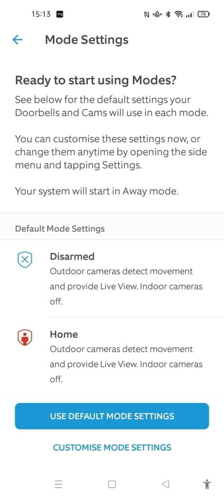 This is a bit more relevant to the indoor cameras and alarm system. With the default modes, the doorbell will always detect motion and provide you with doorbell alerts, but the indoor cameras can be switched off.