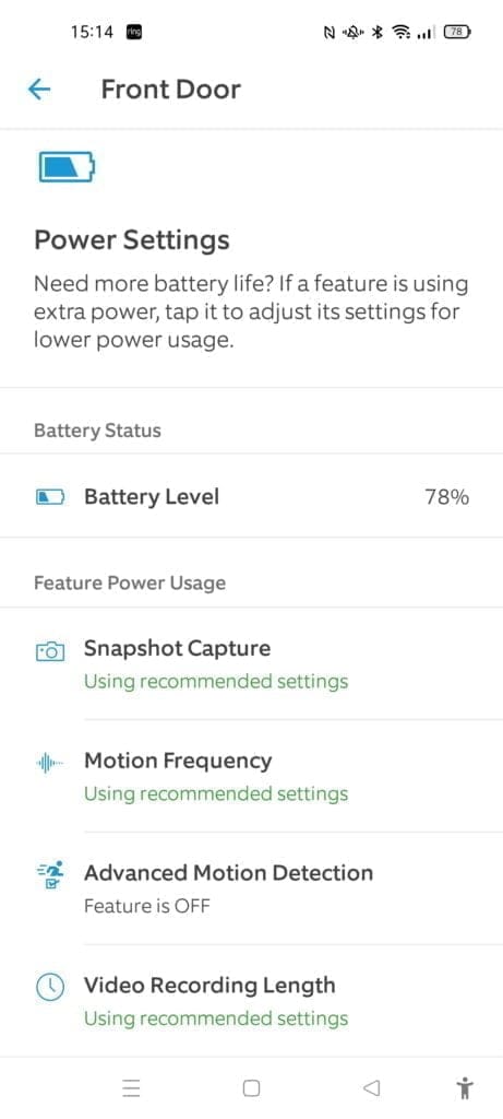 Based on my battery’s current level, I expect to charge it once every 6 weeks, and I have all the settings at the recommended level with advanced motion detection on.