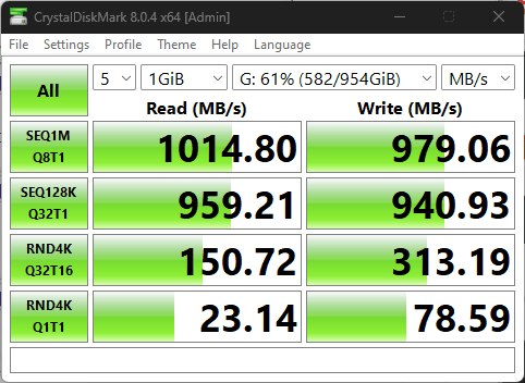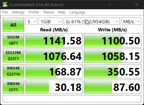 My initial benchmark of the drive inside the enclosure revealed results that were about 10-20% below what I had expected. Well below the 10Gbps limitation of USB 3.2.