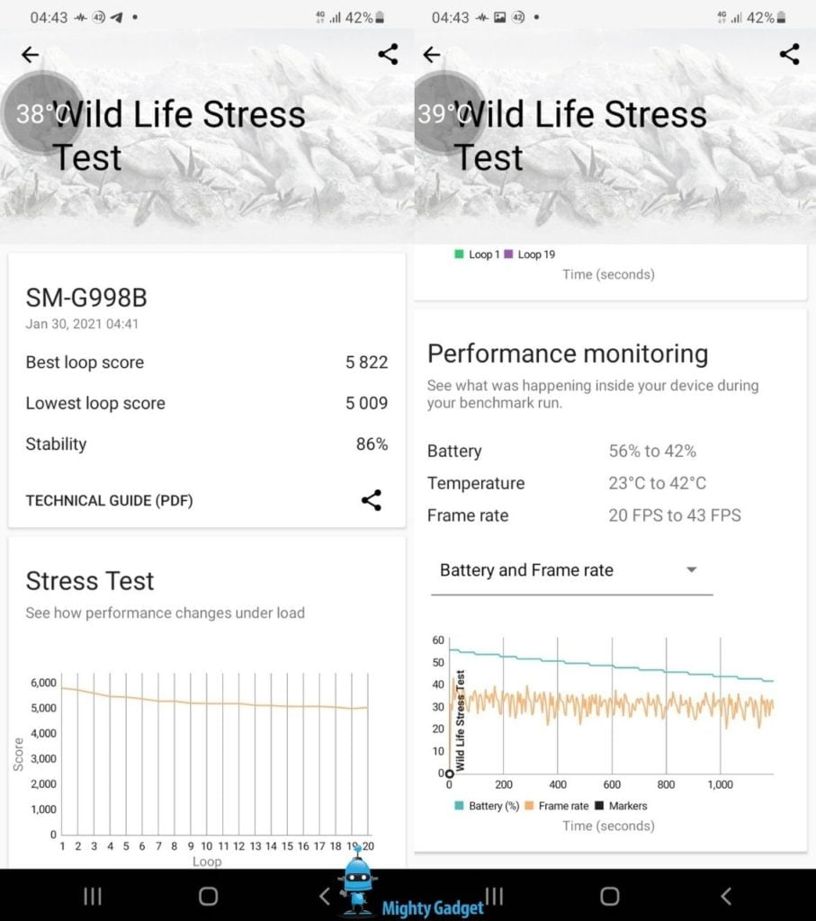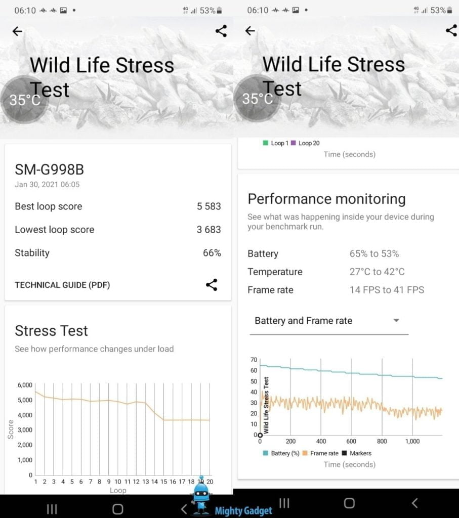 While the Samsung Galaxy S21 Ultra scored lower than the Xiaomi Mi 11 the temperature didn’t rise quite as much, and the battery did, though the Ultra battery is quite a bit larger.