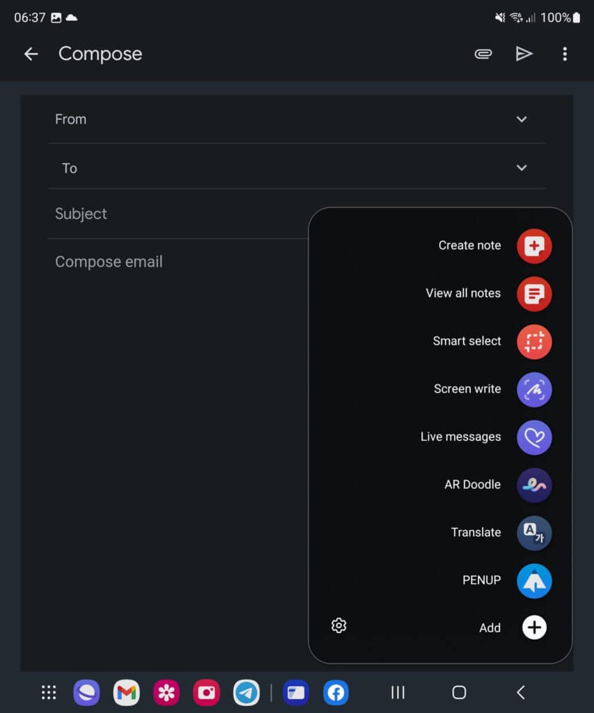 Using the S Pen on the Z Fold 5 is pretty much the same as using it on the Galaxy S23 Ultra. When you press the side button on the stylus, a menu pops up on the screen with various options. You can create a new note, write on the screen, highlight text for translation, and more.