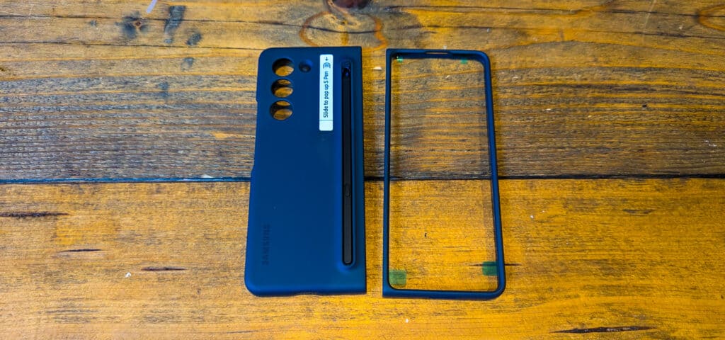 The Slim S Pen Case for Galaxy Z Fold 5 is a two-piece case that covers both the back and front of the device. The back piece houses the S Pen and provides a bumper around the triple camera array. The front piece, a bit thicker than some Fold cases, requires adhesive strips to stay affixed to the screen.