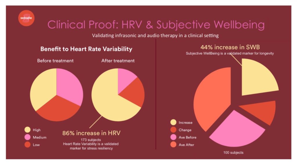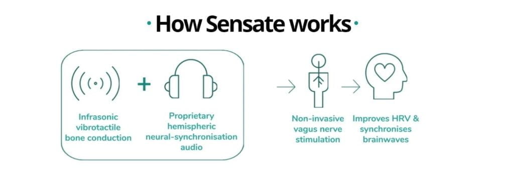 “Sensate uses multi-frequency infrasound to regulate the nervous system and engage the vagus nerve, the neural superhighway that connects the brain to the gut. It’s part of the parasympathetic nervous system and can calm our “fight, flight, freeze” emergency response when stress overwhelms us, bringing our body into balance. It can also improve heart rate variability, which is a key marker for health and general wellbeing.”