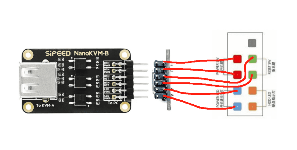 - (Cube only) Attach the ATX board to the motherboard’s power/reset headers, then connect it to the NanoKVM.