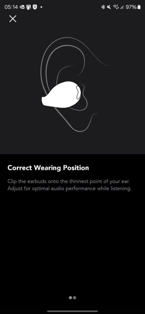 When putting the earbuds on, the recommendation is to slip them on towards the thinner top part of your ear and slide them down so the speaker part rests in your concha and the speaker is directed into your ear canal. Even though I have pretty big ears, I found that I needed the larger silicon grips for the most secure fit. I found the best audio and comfort was when I slid them down far enough that they rest just on the top of my earlobe.