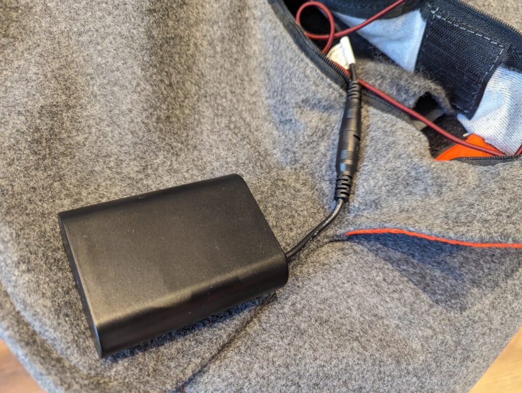 The battery fits into the pocket at the top of the blanket, and the zip running down the back allows you to easily fit and remove it. It has a relatively long cable which then attaches to the charge port and locks into place so you don’t accidentally disconnect it when in use.