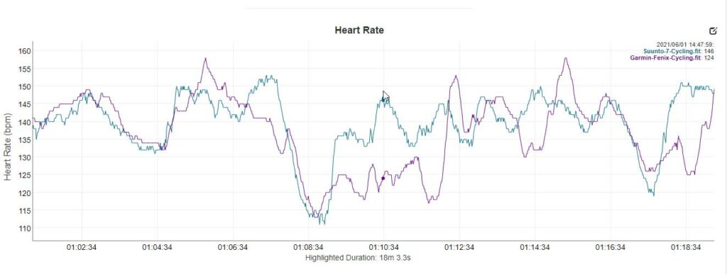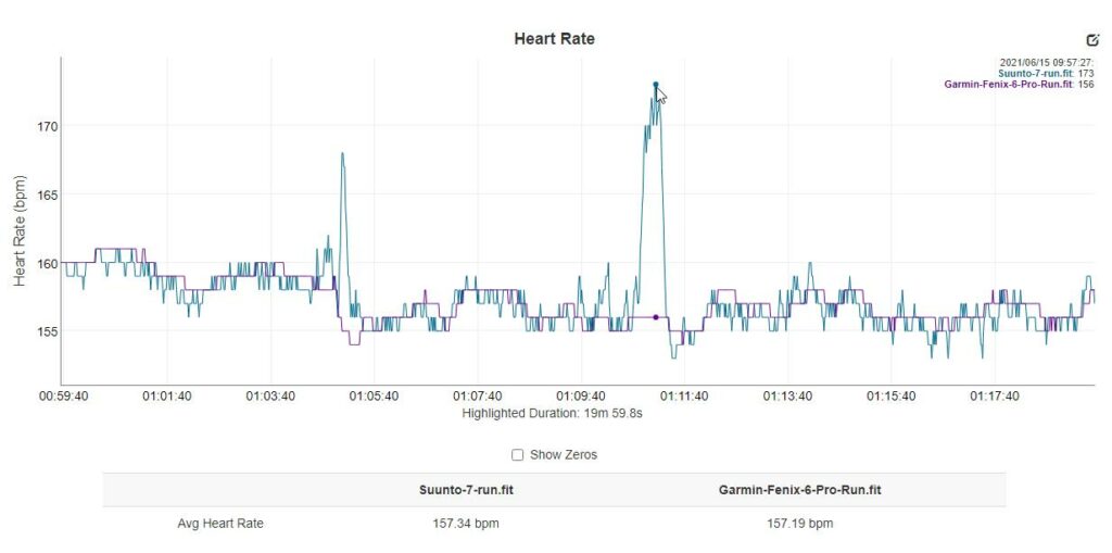 The Suunto 7 did reasonably well, though. In my most recent run, it outperformed the Huawei Watch 3 by a significant margin, and it tracked well with my Garmin Fenix 6 Pro paired with the Polar Verity. There were a couple of big peaks but these were short lived and the overall average HR was about the same.