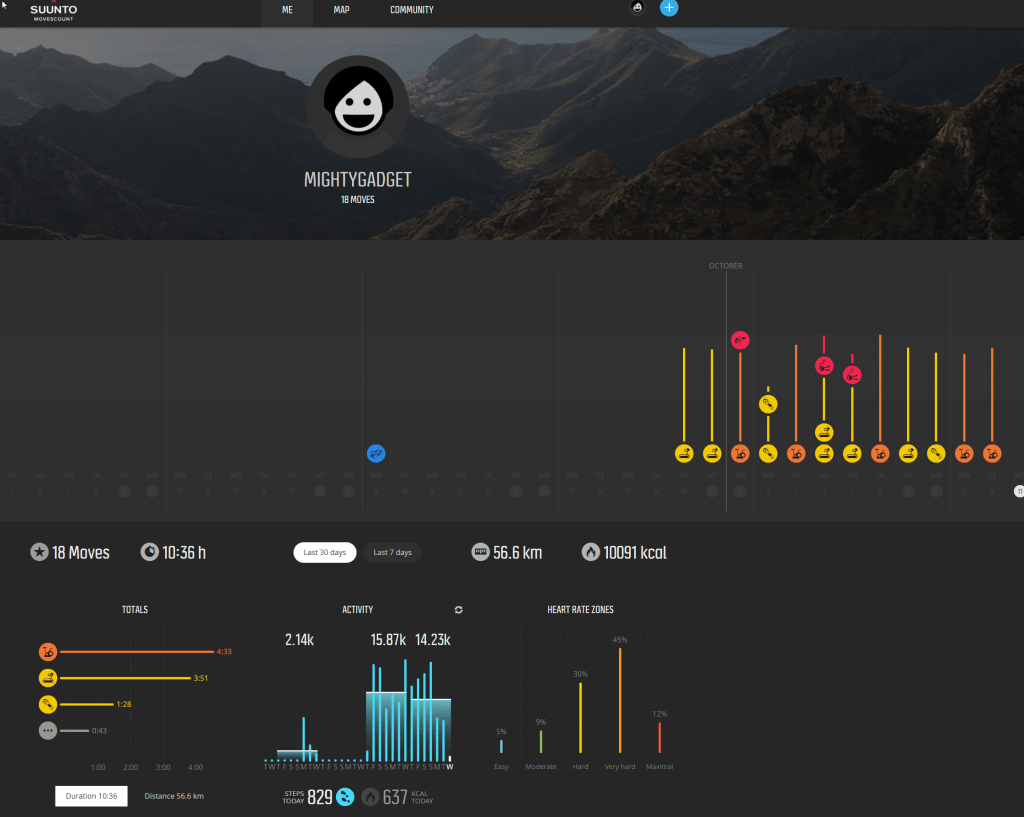 In terms of calorie and step counting, there is a large difference between Garmin (and also FitBit). The Suunto is much more generous with the step counting than Garmin, but it won’t track any steps at all when in cycling mode. which for my can give odd daily steps. Technically this is more accurate than Garmin and Fitbit randomly counting steps. Daily calories, on the other hand, is far less generous, the Suunto general reports around 3k calories per day, whereas the Garmin was generally pushing 4k. In reality, I estimate that I burn around 3.5K a day and as an ex-fatty, I think I would prefer my calories being under-reported to avoid the temptation of eating them back. I have no way of telling which system is correct though, and you should always take calorie and step estimations with a pinch of salt.Activities