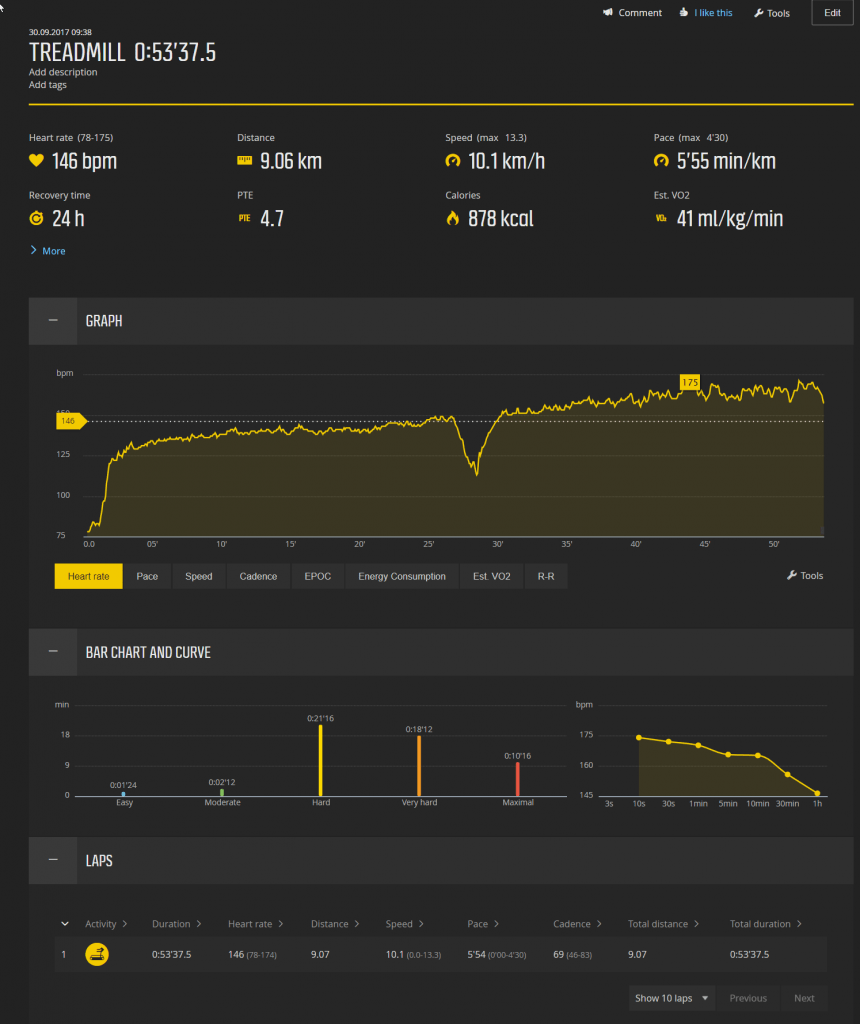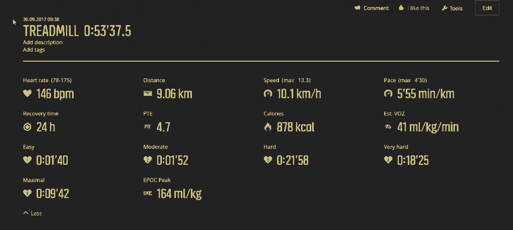 One your activity is complete you are provided even more information than you get from Garmin. As with Garmin, you get a heart rate graph, pace, speed, cadence, ascent and descent as well as the estimated VO2. However, unlike Garmin, you also get EPOC Peak and PTE plus you can grade your activity with a feeling. So, you can mark a bad run as poor or whatever. It is really far more information than any amateur fitness enthusiast could possibly need.