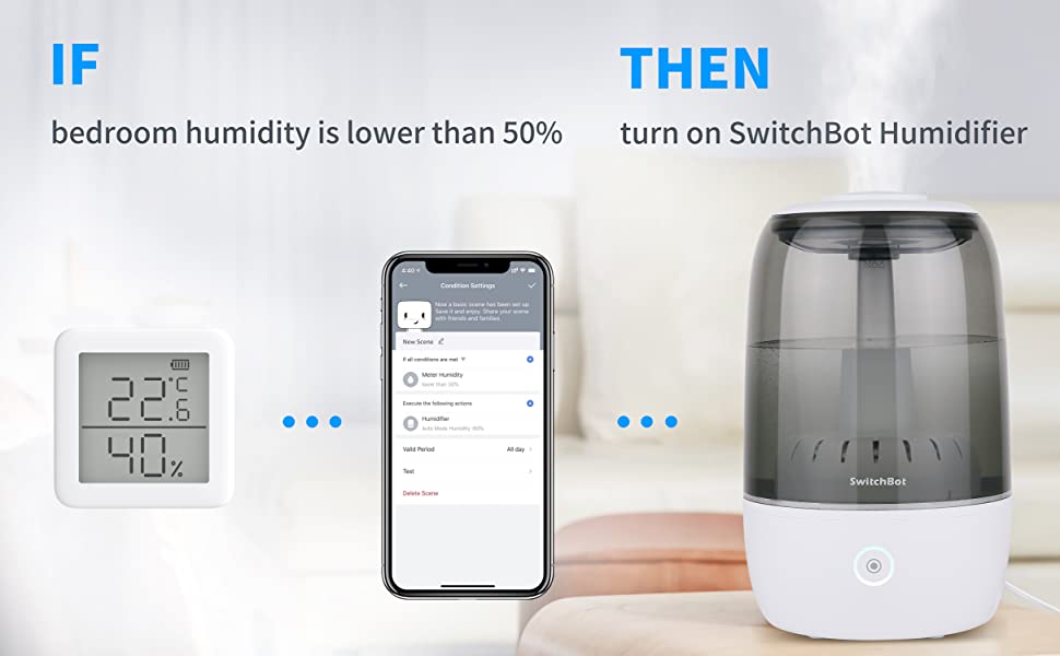 So if the SwitchBot Thermometer/Hygrometer has a low level of humidity, then you can switch the humidifier. This can then also be combined with a schedule, so if at 3pm the humidity is below 50% you can have it come on.
