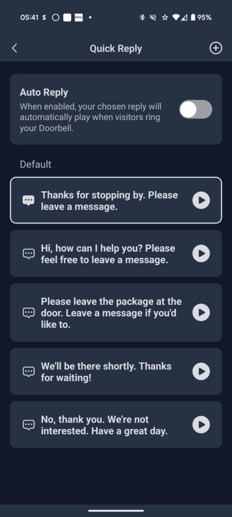 Quick replies are customisable. The app provides five slots for pre-recorded messages that can be played automatically when the doorbell is pressed. You can use the default messages or record your own, up to 10 seconds long. This is a useful feature for when you cannot speak directly to a visitor.