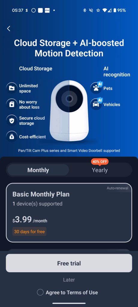 Beyond that, it is average compared to other brands. The camera has basic motion detection and human detection. Then vehicles and pets are walled off into the subscription.