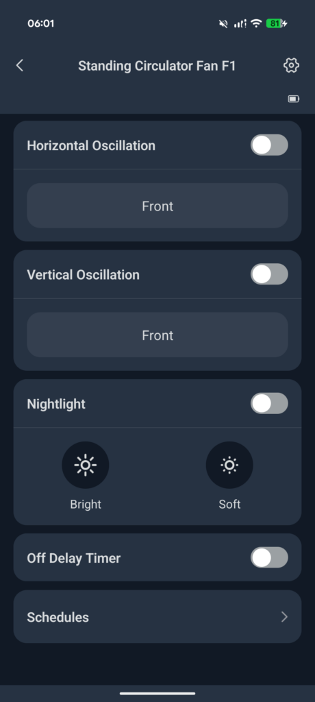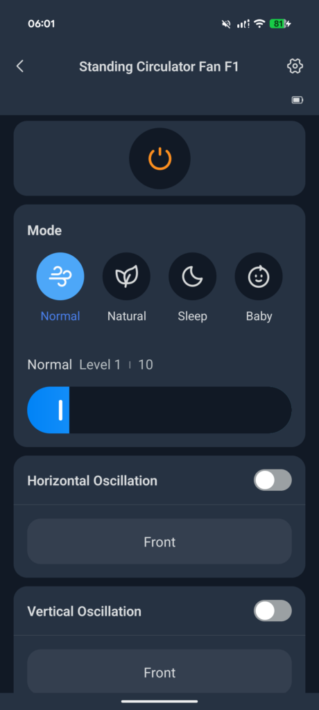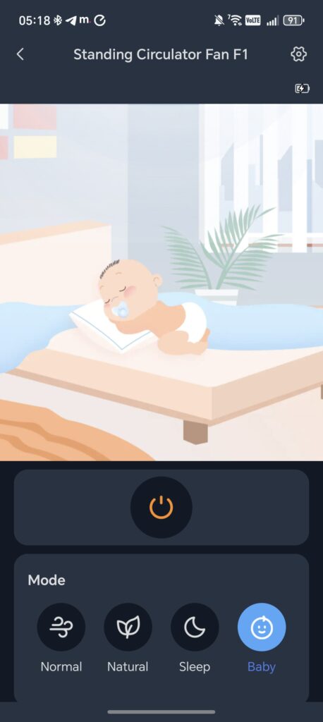 The app controls are functional without being particularly sophisticated. You get speed adjustment from 1 to 100 per cent (compared to the nine discrete physical steps), four operating modes – Normal, Natural, Sleep, and Baby – plus independent controls for horizontal and vertical oscillation. There is also a night light toggle with two brightness levels, an off-delay timer, and scheduling functionality.