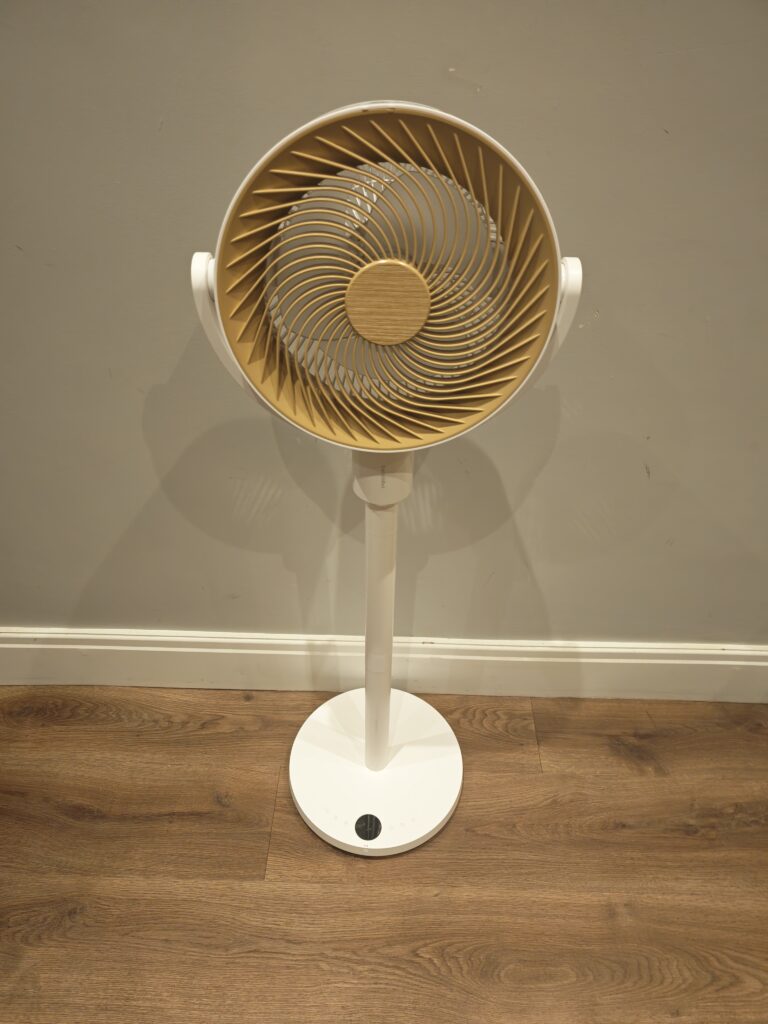 Build quality is adequate. The overall construction is quite plastic in feel, which is not surprising given the ABS material and the £99.99 price point. What matters is that it feels sturdy in use – there are no rattles, no creaks, and no annoying vibrations at any speed setting. The fan head has a natural wood-look centre cap which does give it a more considered aesthetic than the typical all-white plastic fan, and it sits reasonably well in a modern living room or home office.